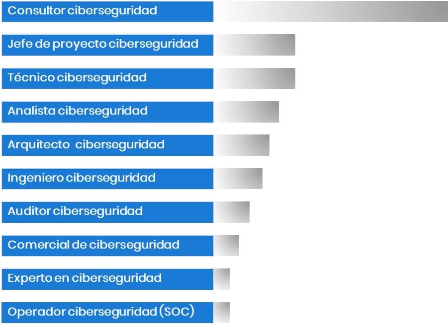 Haciendo uso una vez más de los resultados de las entrevistas realizadas y cuestionarios enviados se concluye que con algunas diferencias los perfiles más comúnmente demandados son: Técnicos de Seguridad TIC, Ingenieros de Ciberseguridad, Consultores de Ciberseguridad Junior, Arquitectos / Técnicos de Ciberseguridad Cloud y Ciberinteligencia, Auditores con experiencia en labores de hacking, Red team y Blue team, Técnicos de seguridad para hacking o con experiencia en monitorización de herramientas SIEM, Técnicos especialistas en gestión de redes, infraestructura y ciberseguridad, Consultores de Ciberseguridad, GRC (Gobierno, Riesgos y Cumplimiento) y Legal y Auditores y expertos en Compliance.