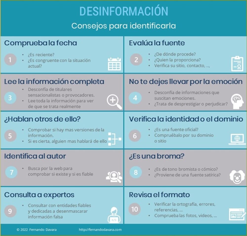 En algunos casos esto no parece algo complicado pues la manipulación es tan burda que es evidente que se trata de un bulo o una broma; pero desafortunadamente no siempre es así. Para facilitar la tarea de identificación a continuación propongo un decálogo de consejos seleccionados entre los recomendados por especialistas en comunicación y desinformación.