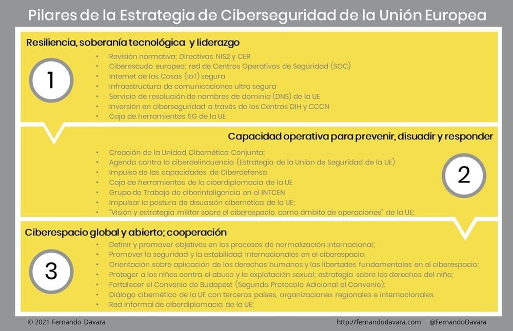 La Comunicación presentada bajo el título The EU’s Cybersecurity Strategy for the Digital Decade aborda las futuras áreas de actuación de la Unión Europea en materia de ciberseguridad basándose en tres pilares fundamentales: Resiliencia, soberanía tecnológica y liderazgo; Desarrollo de la capacidad operativa para prevenir, disuadir y responder; Cooperación para promover un ciberespacio global y abierto.